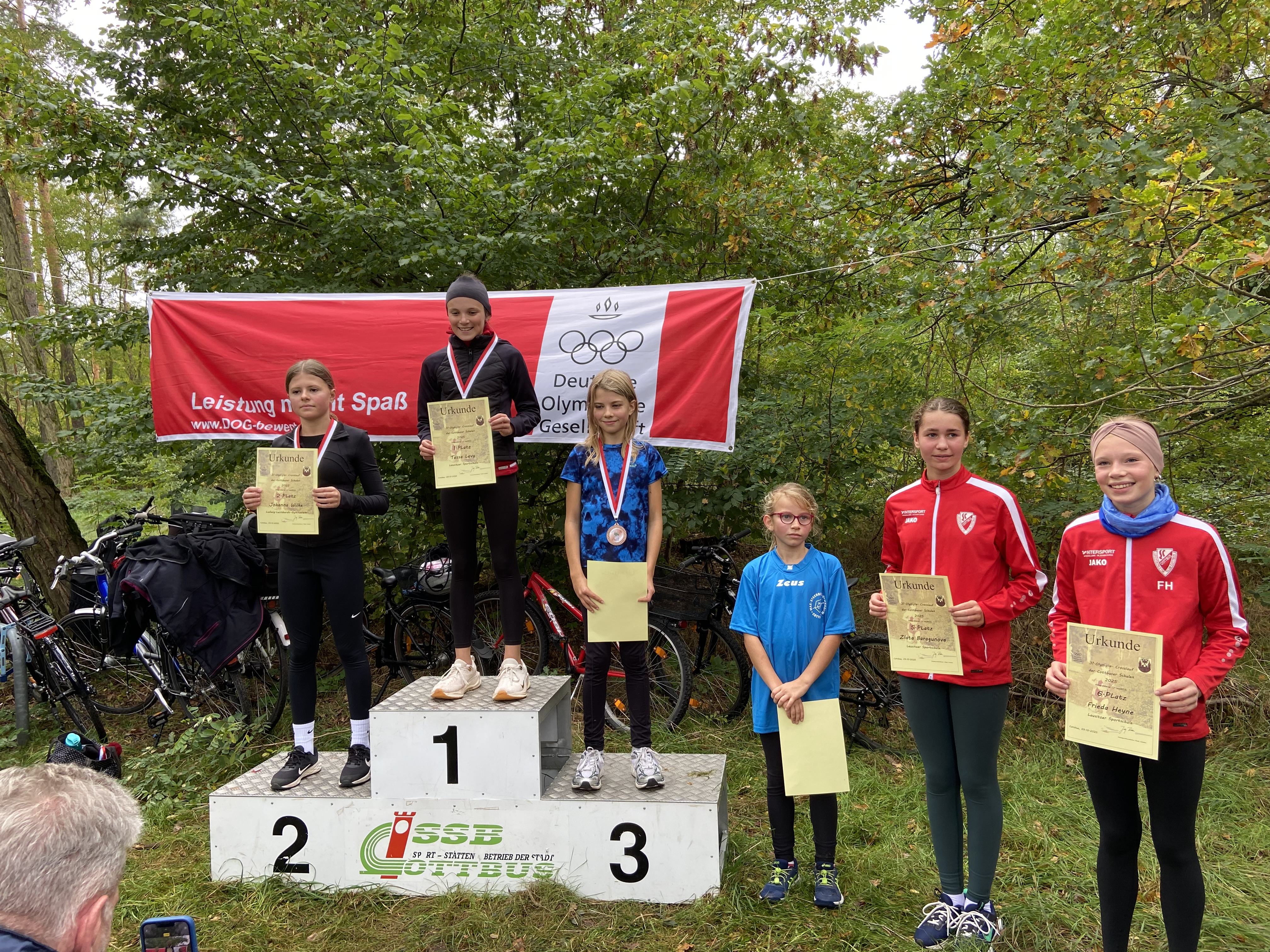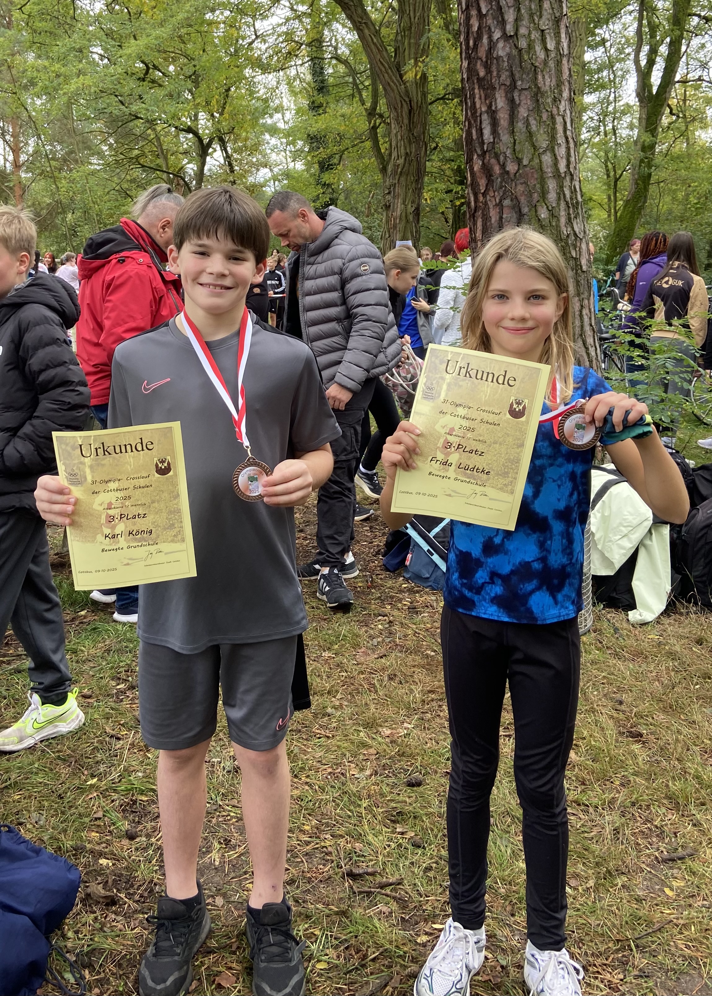 Beim Crosslauf am 09.10.25 gingen zwei Sportlerinnen und drei Sportler an den Start und absolvierten die knapp 2000m Strecke um den Madlower Badesee erfolgreich. Frida setzte sich bei den 12-jährigen Mädchen auf dem 3. Platz durch und erhielt verdient die Bronzemedaille. Auch Karl erlief sich bei den 12-jährigen Jungen die Bronzemedaille. Bei einem Starterfeld von ca 50 Läufern ist dies ein beachtlicher Erfolg. Jesper und Hannes wurden 9. und 10. Platz. Ella absolvierte die Strecke auf dem 15. Rang. Unsere, im Vergleich zu den anderen Teilnehmern, sehr jungen Sportlerinnen und Sportler können sehr stolz auf sich sein. Wir gratulieren zu diesem tollen Ergebnis. Weiter so!