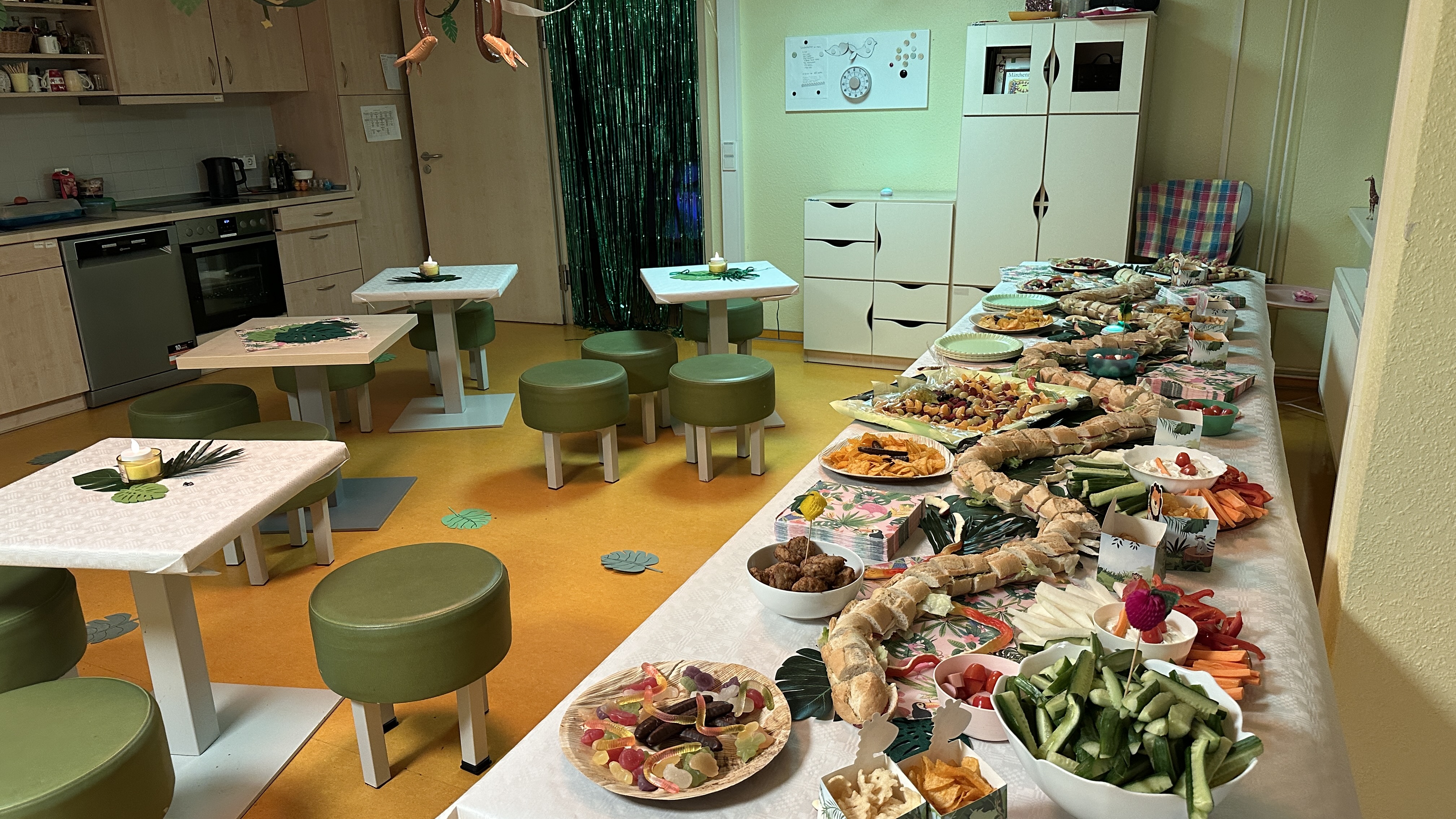Im Hort der Kita "Kirschblüte" wurde ein besonderer Tag gefeiert: eine farbenfrohe Dschungelparty. Der gesamte Hort war liebevoll im Urwaldstil dekoriert – mit Lianen, Blättern und vielen tierischen Details. Auch das Essen passte perfekt zum Motto und begeisterte die Kinder mit kreativen Dschungel-Snacks.